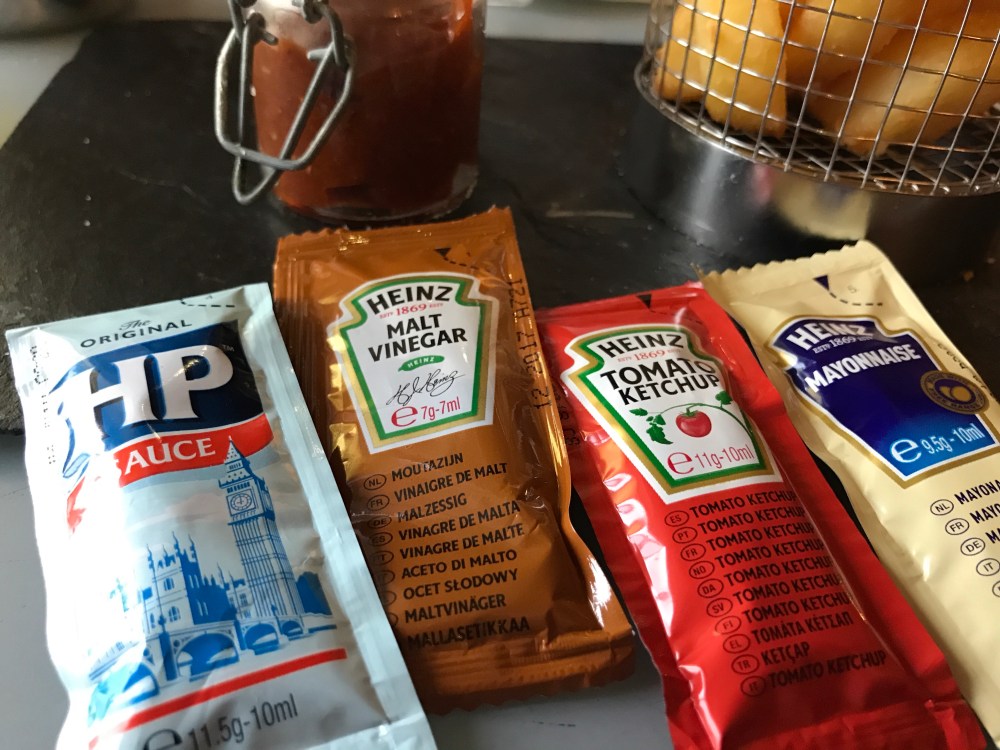 With plenty of time until diner, we grabbed a bite too. Though we do LOVE British Airways and as airplane food goes, they do have some of the best, we just needed something more, but nothing that will ruin dinner…..CHIPS!!! And like in Ireland, the tables are stacked with condiments that know the way to my heart!!!! …what doesn’t Mayo, Ketchup, Malt Vinegar & HP Sauce maker better??!! The only thing missing was some Coleman Mustard!!