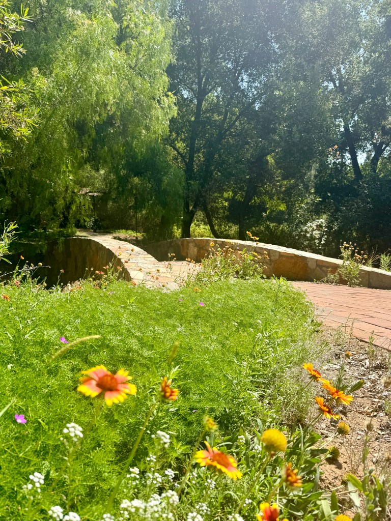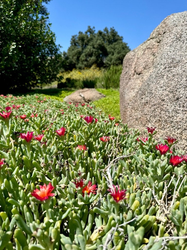 Meandering the paths on my way, taking in my surroundings, I came upon a pond I don’t recall seeing last year. It was full of koi fish and turtles basking in the sun. I paused to take it in (and snap a pic) and realized the fish were approaching me, perhaps hoping for food. I made a mental note to Google what is safe for koi fish to eat and snag some from the dining hall tomorrow. I passed a cluster of tiny cacti I recall enjoying last year, watching them throughout the day. In the morning, they are a wash of green, but as the day progresses and the sun shines, they awaken, red flowers blooming from their stalks to absorb the sunlight. Then, as the day winds down, they tuck their flowers in, safe, sound, and asleep until the next light. Sounds like my daily routine. 😂
