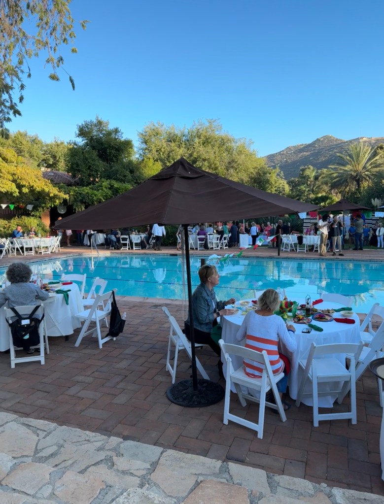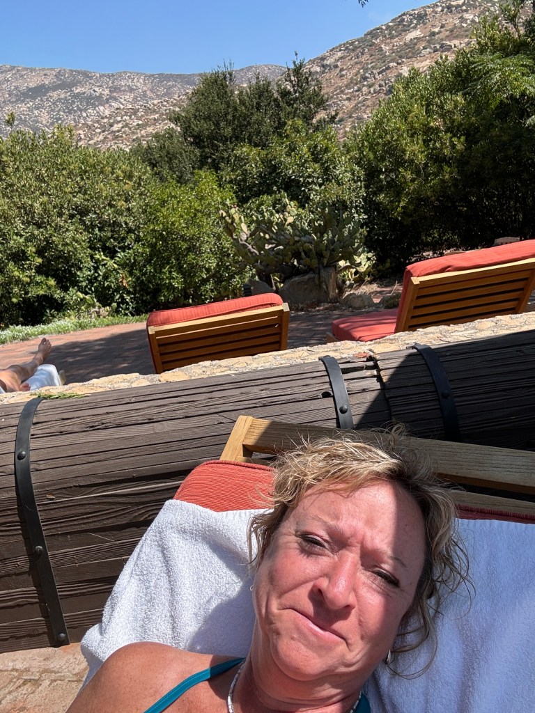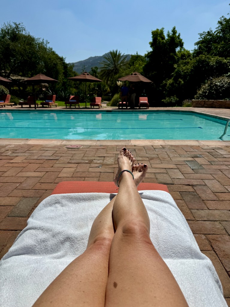 Carrying on through the paths towards the pool, while passing one of the outdoor dining areas surrounding the main dining hall, I hear “Erin” and find Mom at a table of five, making friends, of course! 🙂 I popped over, met her friends, checked in with each other, and said she’d join me later once I told her my destination of the Central Pool—there are three here at the ranch to enjoy, so as not to confuse.