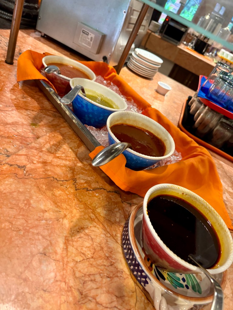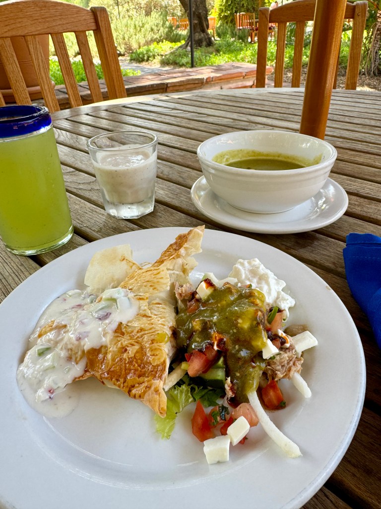 Additionally, I sprinkled some of my favorite staples available at every meal – a dash of ranch salsa and a splash of Matcha Salsa (I need to learn how to recreate this; they sell jars at the Mercado, too big for my carry-on, but I snapped a pic of the ingredients… challenge accepted) then a dash of tomatillo salsa. Voila—lunch is served. I almost forgot to add the side of the daily soup and a glass of fresh cucumber and mint juice. Why not?
