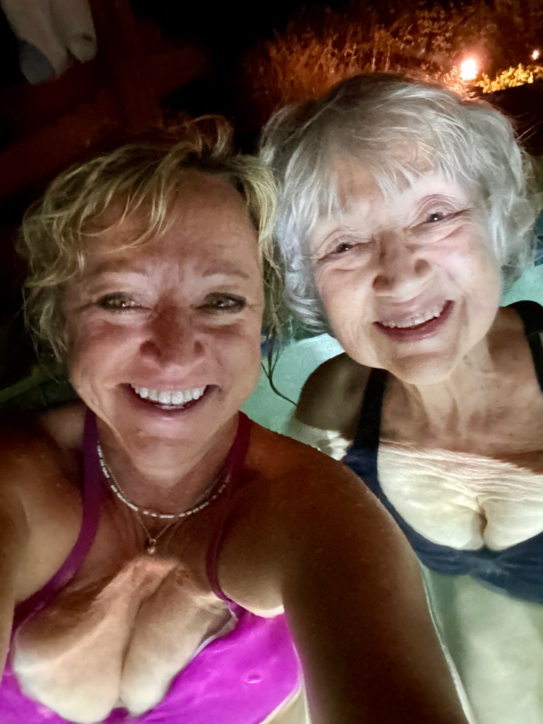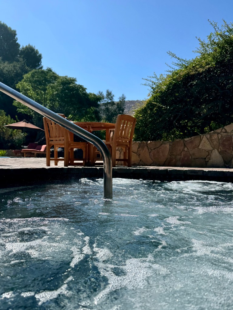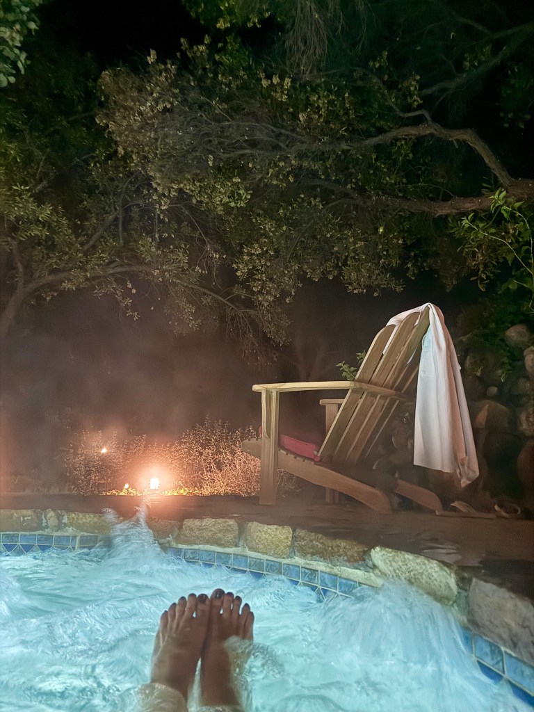 To top the night off, when we returned to our villa’s courtyard, the hot tub was open, which wasn’t the previous evening. 🙌 We learned, talking with our table friends at dinner, that we could request it stay open past 6:00. I came upon it first and hollered back to Mom (maybe a bit too loudly, opps) — “LOOK IT’S OPEN!” We quickly went to change, hurrying back, worried someone might close it before we got back. Talk about speed dressing; if that was an Olympic sport, hang the gold around my neck!! I arrived first, with wine in hand, turned on the bubbles, and I have to say, it was the perfect way to end such a fun day.
