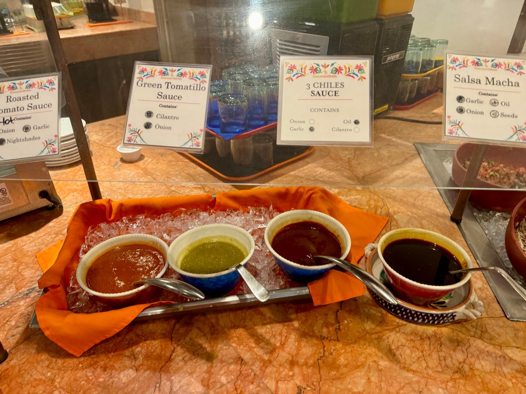 When I returned to the dining hall, I found Mom in the same place. Informing her of my change of plans, she again said she would join me at the pool later, specifically the Villa Pool. I grabbed a quick bite of AMAZING samosas with tzatziki dressing and a serving of my favorite lunch salad concoction, which included lettuce greens topped with an assortment of the day’s fresh or roasted veggies —sliced jicama, cucumbers, and tuna, along with a smidge of cottage cheese (don’t knock it until you try it). Then, I topped it with both dressings of the day (because, as everyone who knows me knows… I am a sauce whore) – herb vinaigrette and today’s creamy cilantro. BUT WAIT, THAT’S NOT ALL!